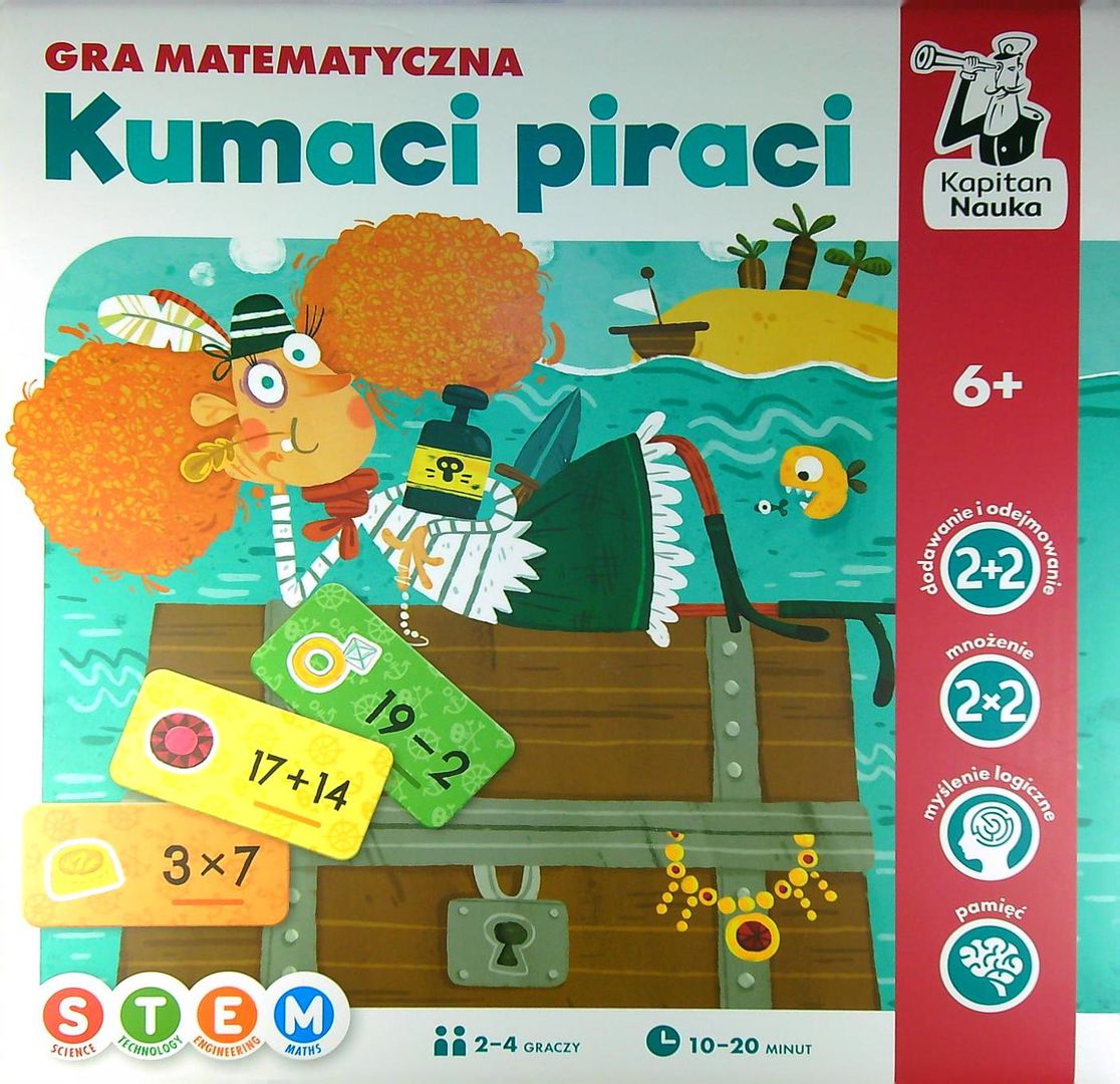 „Kumaci piraci” (6+) to matematyczna bitwa o skarby, w której gracze wcielają się w role piratów i wykonują działania na dodawanie i odejmowanie w zakresie 100 z podziałem na dwa poziomy trudności oraz mnożenie w zakresie 1–50. Ile jest 4x5, a 18+2? Wylosujcie działanie, wykonajcie je i sprawdźcie wynik! Podpowiedź będą stanowiły pirackie trofea – jeśli są takie same na żetonie i planszy – zbieracie skarb. Wygrywa ten, kto pierwszy zgromadzi sześć pirackich trofeów i umieści je w skrzyni. W tym emocjonującym wyścigu po skarby przydadzą się koncentracja, dobra pamięć i spostrzegawczość. Przy okazji gracze będą trenować umiejętności szybkiego liczenia w pamięci i myślenie logiczne. Atrakcyjna gra, która rozwija umiejętność dodawania, odejmowania i mnożenia pamięciowego, trenuje spostrzegawczość i spryt oraz doskonali zdolność myślenia. Świetnie sprawdzi się podczas rodzinnych rozgrywek, zabaw w świetlicy i pracy na lekcji. Joanna Palińska – matematyk, doradca metodyczny we Wrocławskim Centrum Doskonalenia Nauczycieli, członek Stowarzyszenia Nauczycieli Matematyki oraz grupy Superbelfrzy RP. Autorka bloga Matematyka w podstawówce. Gra „Kumaci piraci” wykorzystuje STEM (ang. Science, Technology, Engineering, Maths), czyli nowe podejście do uczenia się, które rozwija umiejętność myślenia logicznego, rozwiązywania problemów i skutecznego komunikowania się. Gracze zdobywają nowe umiejętności dzięki wykorzystaniu naturalnych zdolności, takich jak pomysłowość, chęć eksperymentowania oraz ciekawość świata. Doskonalą przy tym kompetencje przyszłości, m.in. koncentrację, wytrwałość oraz cierpliwość w poszukiwania rozwiązań. Plansze i żetony zostały wykonane z grubej tektury, co gwarantuje wytrzymałość nawet podczas najbardziej emocjonujących rozgrywek.[empik]