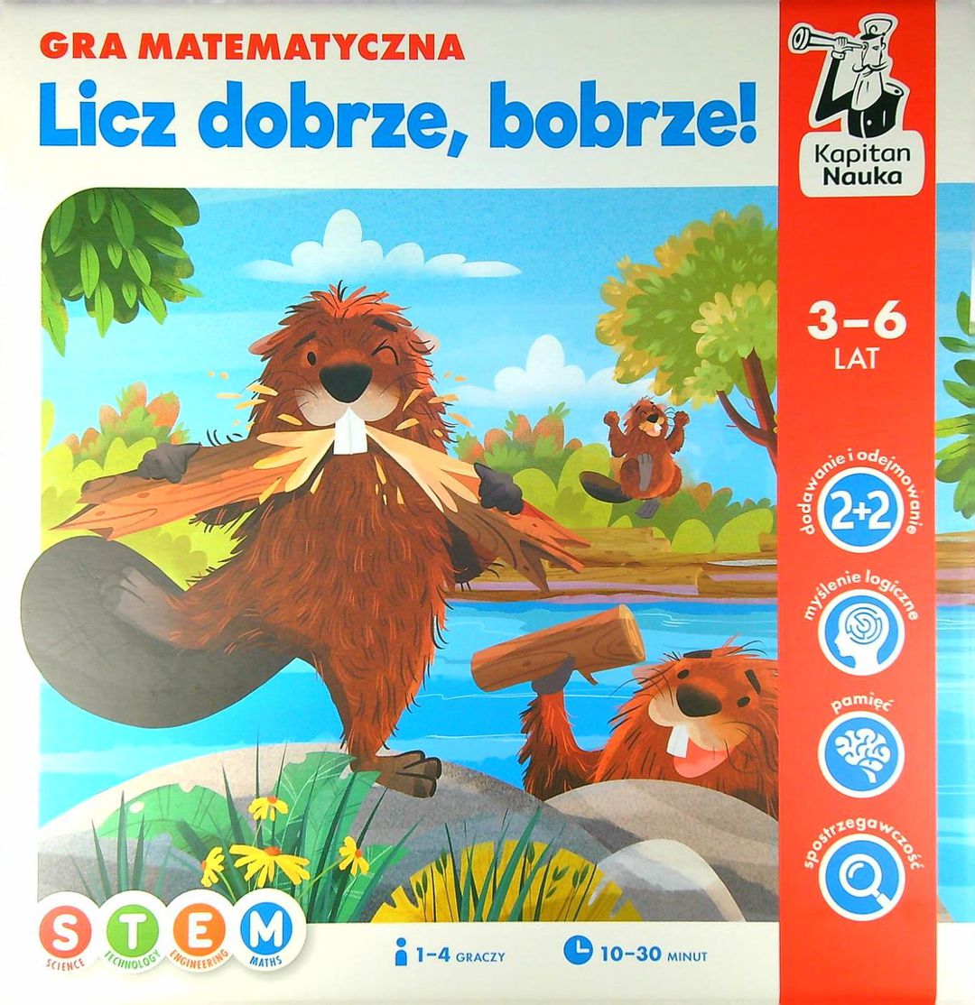 „Licz dobrze, bobrze” (3–6 lat) to gra matematyczna dla przedszkolaków, które dołączają do ekipy pomysłowych bobrów i ścigają się z innymi graczami, układając tamę. Przy okazji ćwiczą liczenie w zakresie 1–20 i umiejętność myślenia logicznego. Gracze mają do wyboru dwie rozgrywki: do 10 lub 20. Z pomocą planszy ze wskazówką losują belkę drewna i kombinują, jak ją ułożyć, by jak najszybciej powstała tama. Dzięki żetonom specjalnym mogą zdecydować, jakiej długości belki potrzebują. Wygrywa ten, ko pierwszy ułoży trzy poziomy tamy. Gra „Licz dobrze, bobrze” jest oparta na metodzie STEM (ang. Science, Technology, Engineering, Maths), wykorzystującej nowe podejście do uczenia się, które rozwija umiejętność myślenia logicznego, rozwiązywania problemów i skutecznego komunikowania się. Gracze kształtują nowe umiejętności dzięki wykorzystaniu naturalnych zdolności, takich jak pomysłowość, chęć eksperymentowania oraz ciekawość świata. Doskonalą przy tym kompetencje przyszłości, m.in. koncentrację, wytrwałość oraz cierpliwość w poszukiwania rozwiązań. Plansze i żetony zostały wykonane z grubej tektury, co gwarantuje wytrzymałość nawet podczas najbardziej emocjonujących rozgrywek.[empik]