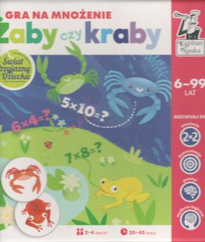 Żaby czy kraby : gra na mnożenie / redakcja: Hubert Bobrowski ; ilustracje i projekt graficzny: Ewa Iwaniuk. - Warszawa : Edgard, © 2019. - 1 pudełko (plansze działań, żetony działań, plansze gry, żetony do gry, instrukcja) : ilustracje ; 25x25x6 cm.